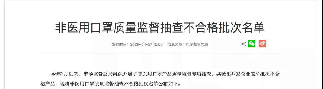 4月27日晚,國(guó)家市場(chǎng)監(jiān)管總局官網(wǎng)曝光了疫情以來首批非醫(yī)用口罩抽查情況,包括47家企業(yè)的51批次不合格產(chǎn)品。