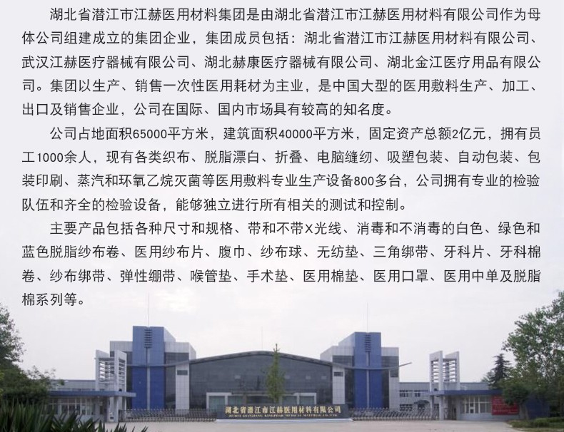 湖北江赫醫(yī)用材料有限公司是中國大型醫(yī)材生產(chǎn)企業(yè),從事于醫(yī)用衛(wèi)材行業(yè)已經(jīng)有30年的歷史,是中國醫(yī)用衛(wèi)材行業(yè)出口十強企業(yè)之一,公司是同行業(yè)最早通過ISO國際質(zhì)量管理體系、CE認證的企業(yè)之一。