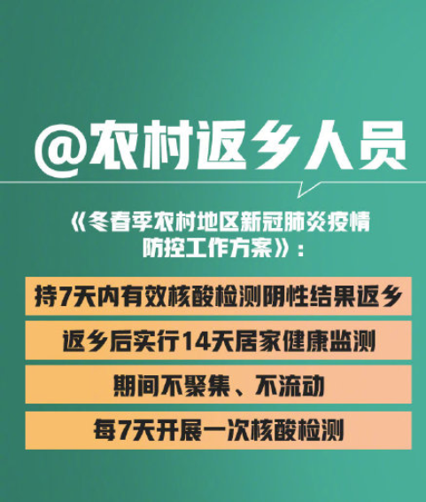 1月20日,國家衛(wèi)生健康委發(fā)布了《關(guān)于印發(fā)冬春季農(nóng)村地區(qū)新冠肺炎疫情防控工作方案的通知》,提出返鄉(xiāng)人員需持7天內(nèi)有效新冠病毒核酸檢測陰性結(jié)果返鄉(xiāng),返鄉(xiāng)后實行14天居家健康監(jiān)測,期間不聚集、不流動,每7天開展一次核酸檢測。